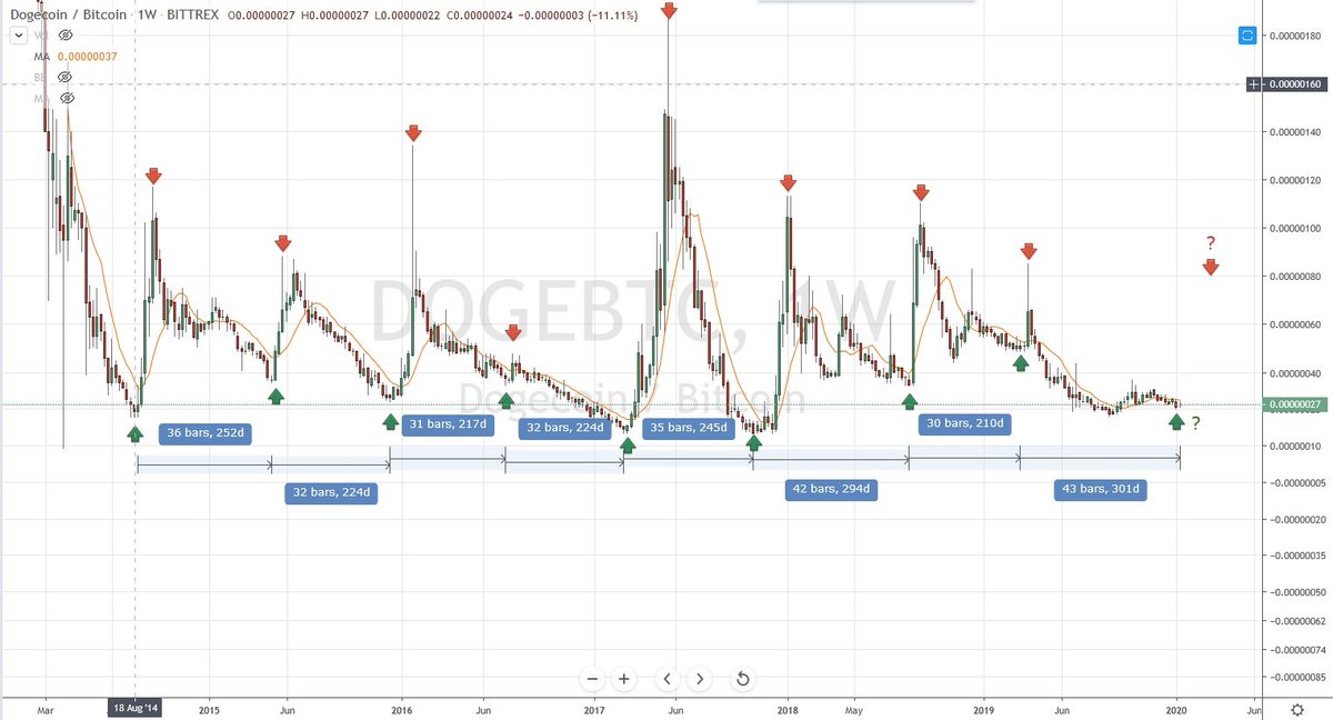 Bob Loukas On Twitter Doge Doge Coin Weekly Cycle Chart Based On 5 Years Of Fairly Consistent Cycle Pumps Now Right At The Longest Length The Only Alt I Remain Patiently